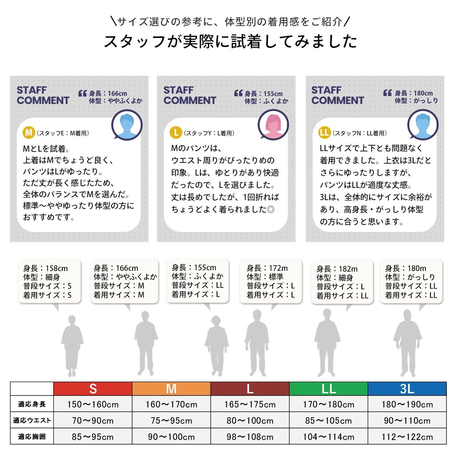 LLサイズ 上着 着丈 約76cm 肩幅 約68cm 袖丈 約38cm パンツ ウエスト 約80-124cm ズボン丈 約107cm 股下 約70cm