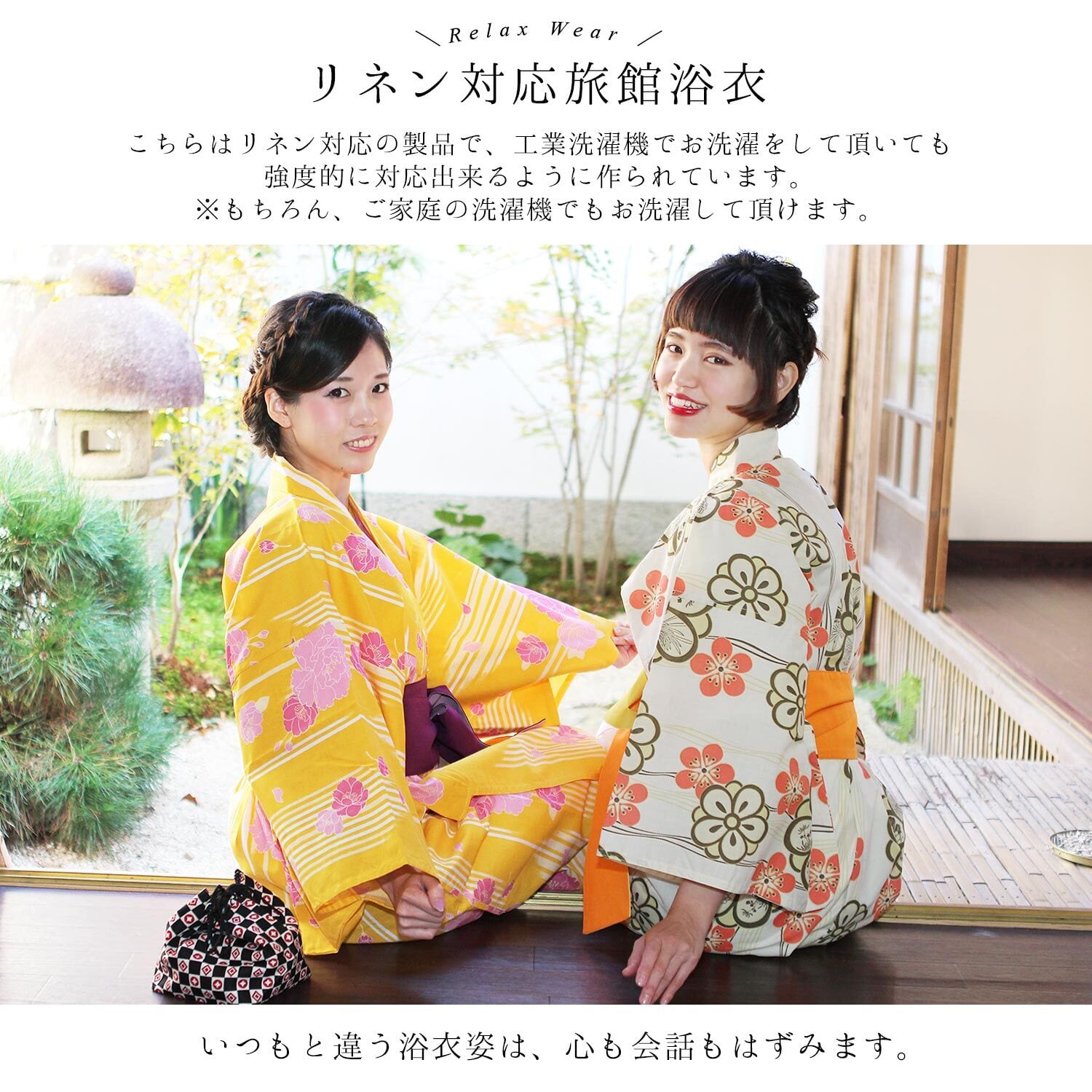 外湯めぐりにでかけたり、旅先のお風呂上りの浴衣として旅館やホテルなどで実際に使用されている、旅館浴衣です。